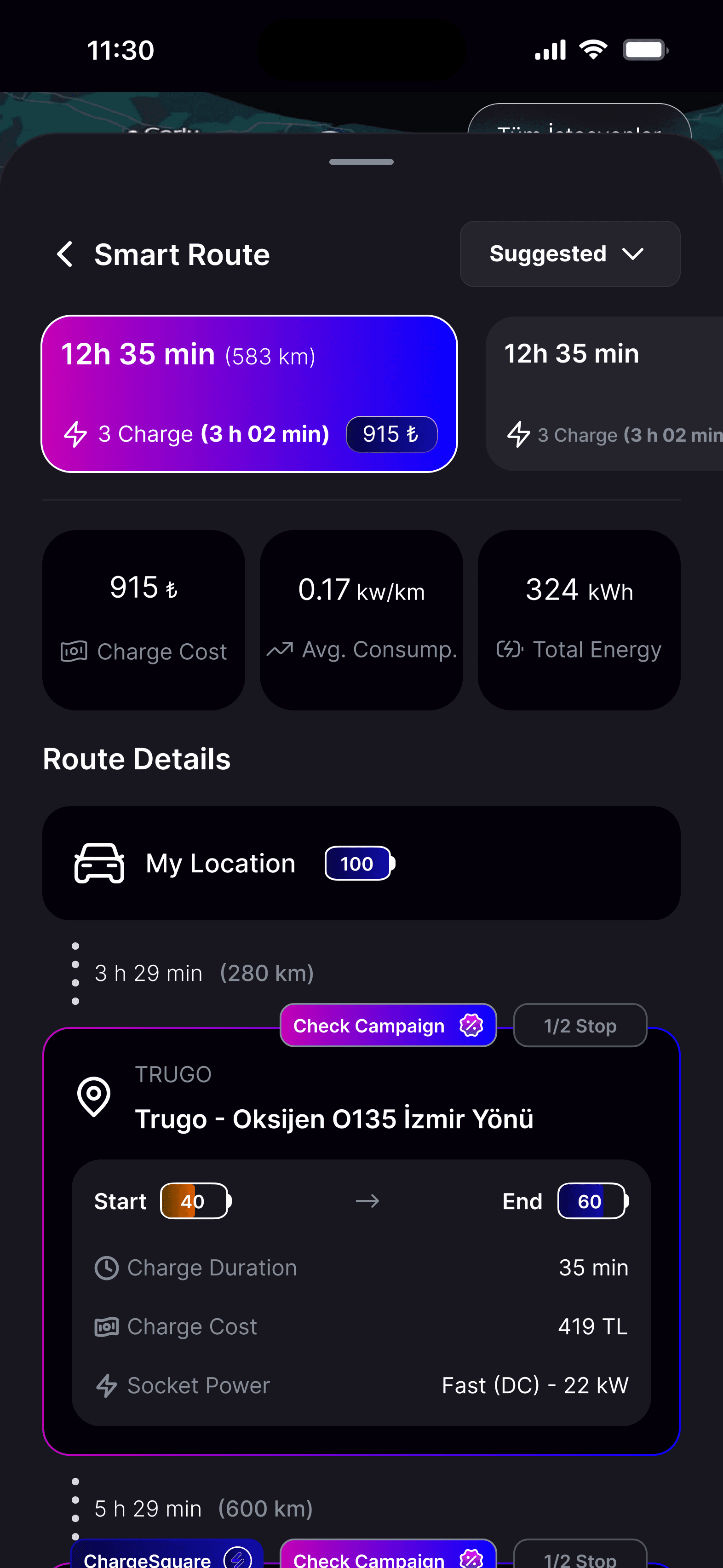 Generate the most efficient route in real time. Traffic, charger locations, and battery range are analyzed to recommend the optimal charging path.